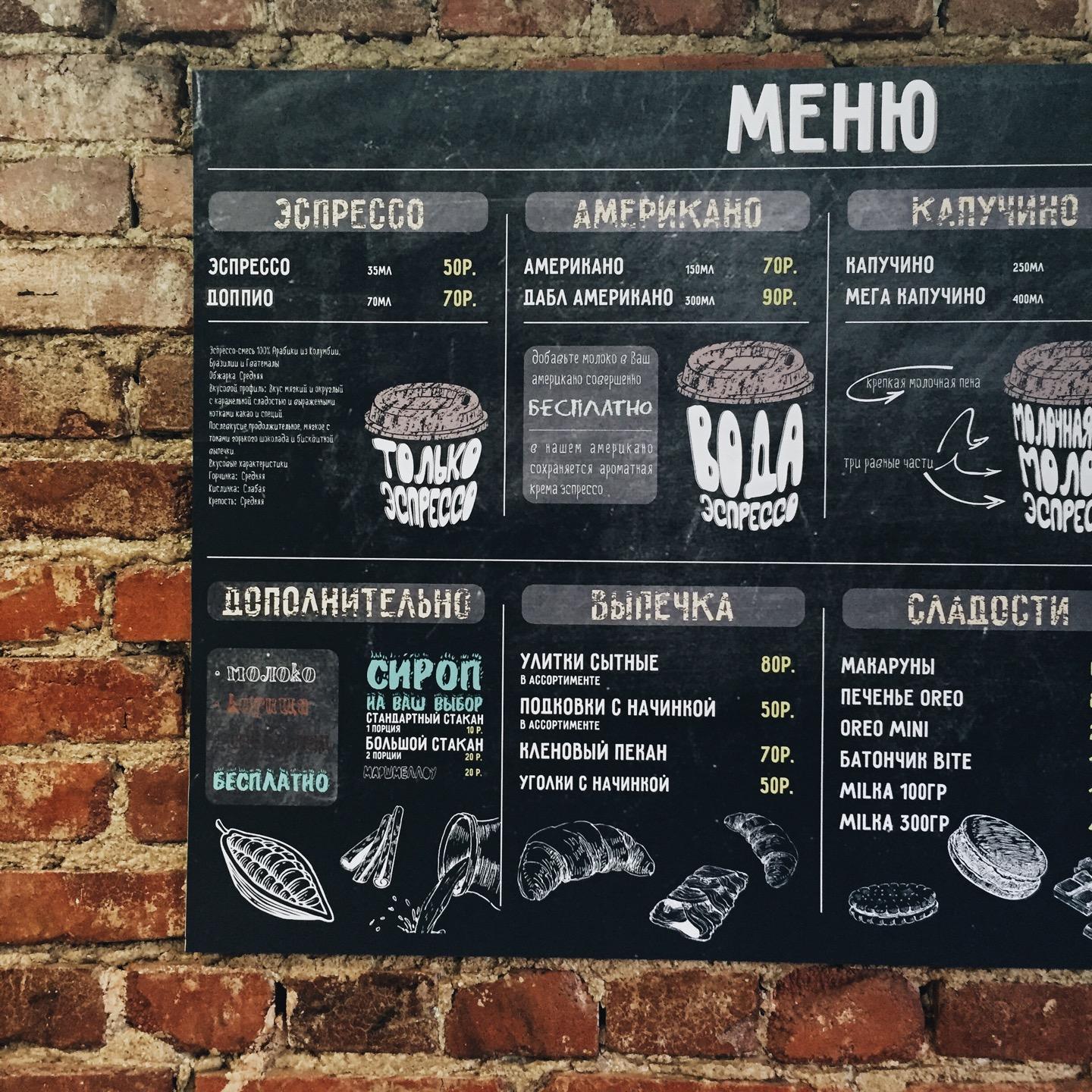 Милое местечко, приятный бонус в виде картонки вокруг стакана,что б не обжечь руки. А вот девочка-продавец могла бы быть и поприветливей, скрывая свои негативные эмоции во время обслуживания клиентов.